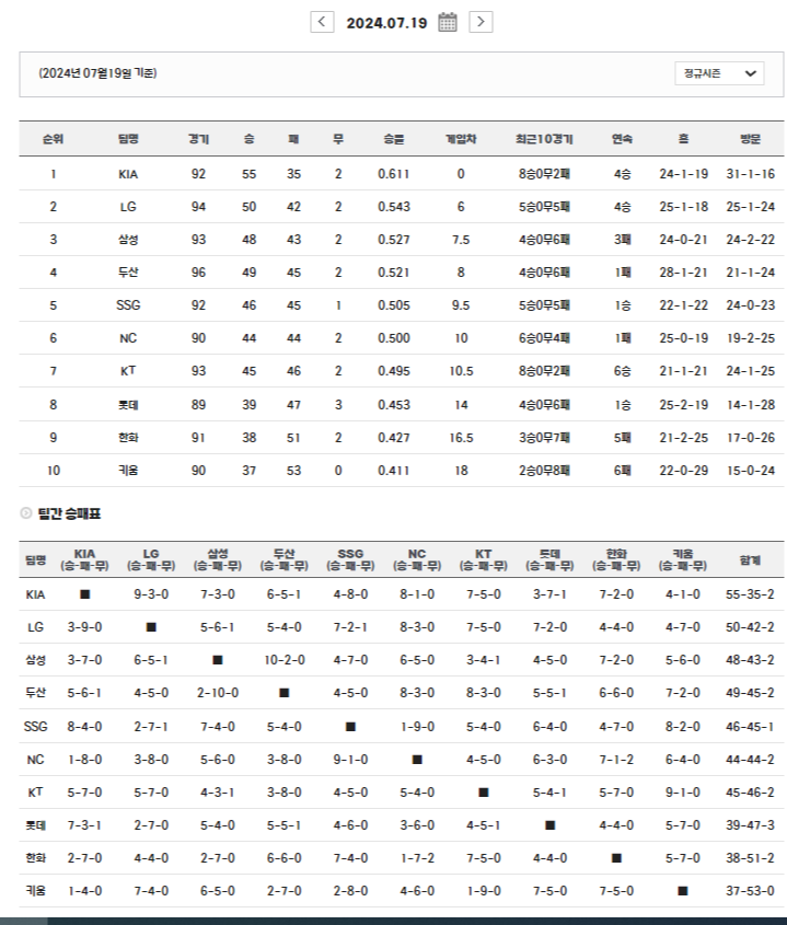 | 2024년 7월 17일 기준, 프로야구 팀간 승패표, 팀간 전적, 프로야구 상대 전적, 팀별 순위표 총정리 (0) | 2024.07.18 |
